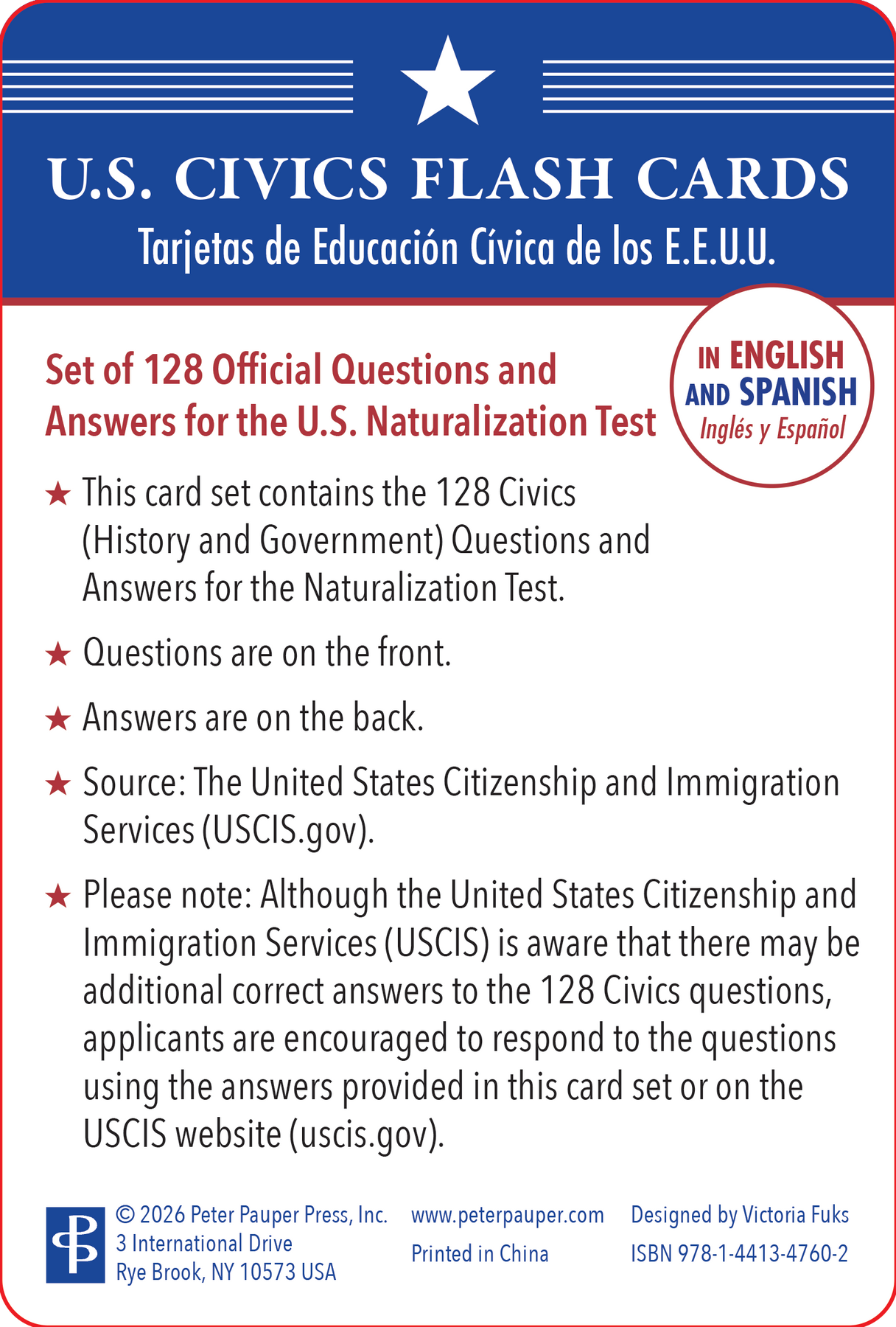 • Includes all 128 official Civics (History and Government) questions and answers for the U.S. Naturalization Test. Incluye las 128 preguntas y respuestas oficiales de Educación Cívica (Historia y Gobierno) para el examen de naturalización de EE. UU.