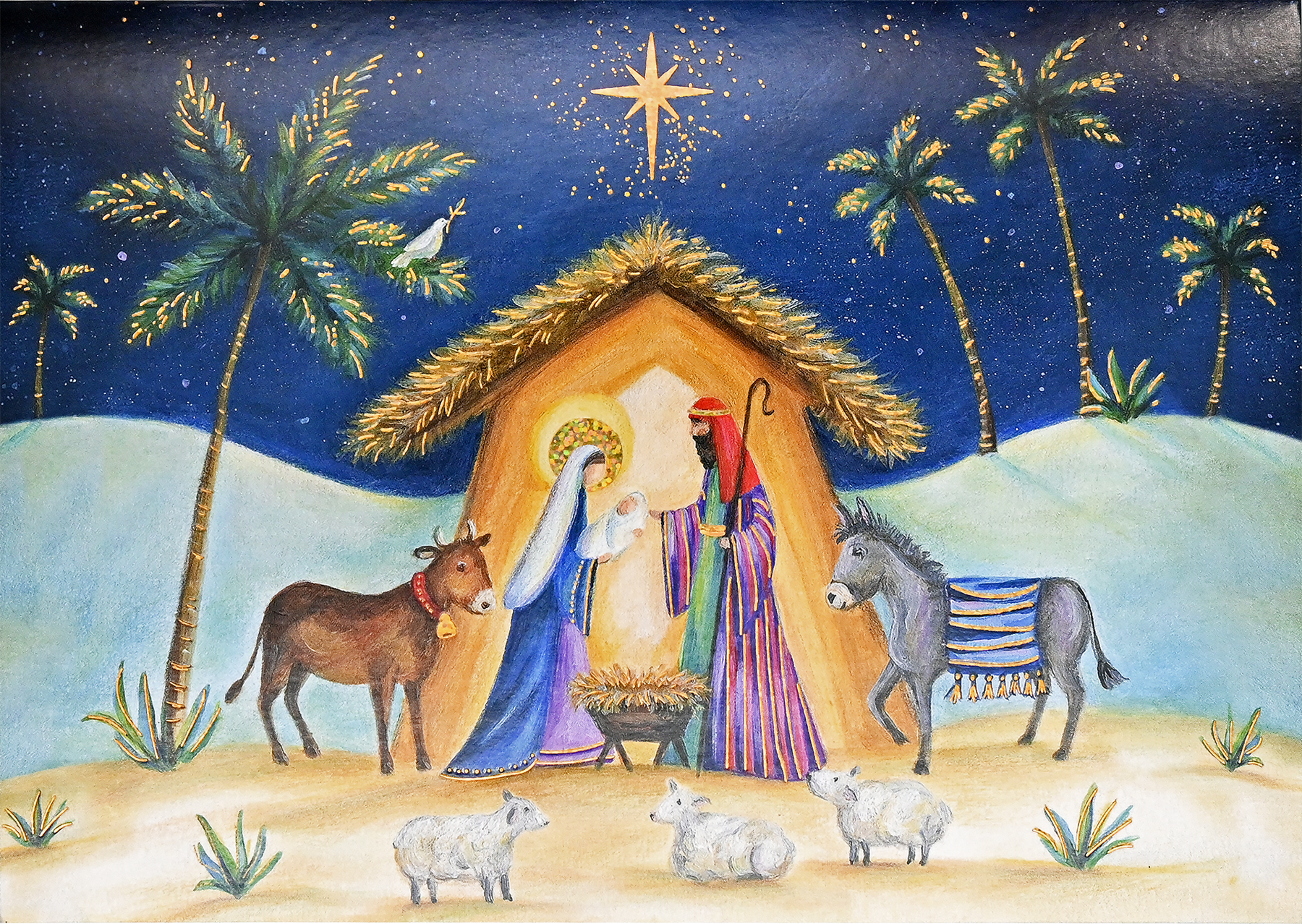 The ox, the donkey, three sheep, and a dove of peace gather around the Holy Family on this lovely depiction of a Nativity night beneath the Christmas star.