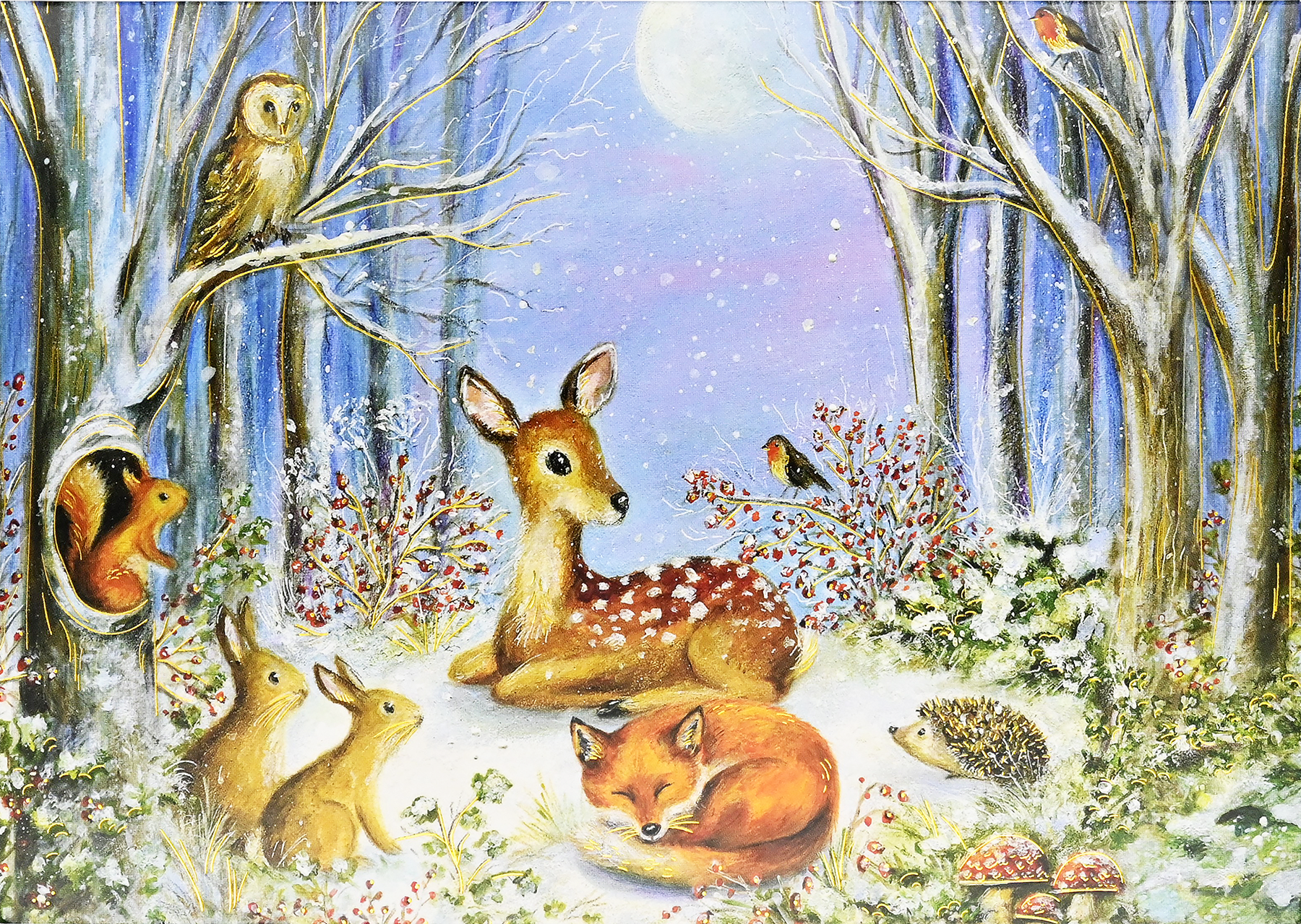 Whimsical greeting cards depict a fawn, a fox, two rabbits, a squirrel, an owl, an English robin, and a hedgehog sharing a moment beneath a full moon.