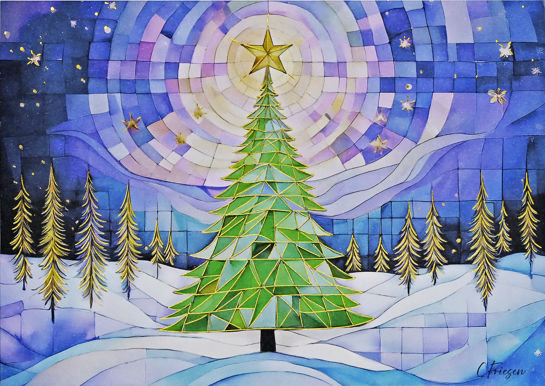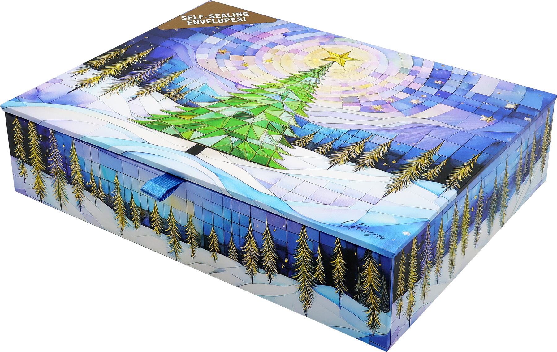 Stunning greeting cards combine the rich colors of stained glass with the image of a beautiful Christmas tree.