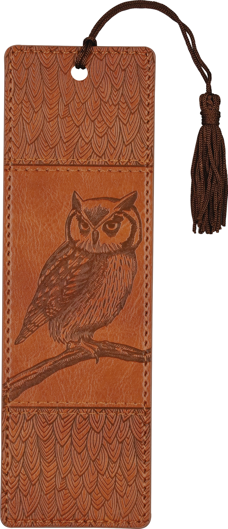 Crafted of vegan leather, charming owl bookmark is adorned front and back with detailed, feather-like embossing and decorative stitching!