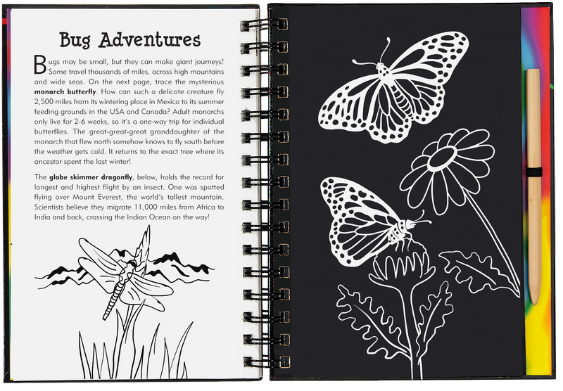 Includes 20 black-coated scratch-off pages, 20 illustrated pages with informative text, and 20 extra pages for independent drawing and sketching.